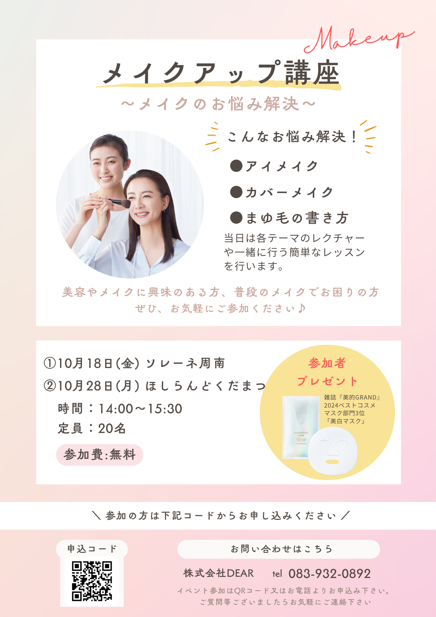 美容やメイクに興味のある方、普段のメイクでお困りの方、ぜひお気軽にご参加下さい。